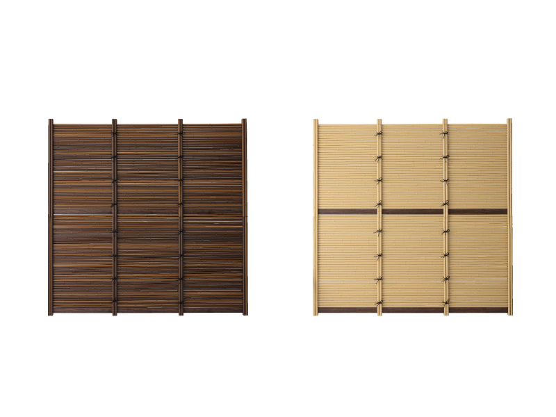 耐候性に優れた人工丸竹を使ったユニット。カラーバリエーションにも優れており、骨組み、丸竹、バンロープなど全て組み立て済みで、施工が簡単なユニット。規格サイズはH900/H1200/H1500/H1800/H2200。柱別売。