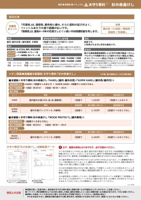木守り専科「杉の赤身けし」は、杉の赤身材を1回塗りで無垢の白太材のように見せる。 これにより赤身材を仕上げ材として利用することが可能となる。 また、屋外では雨、紫外線から杉を守る。