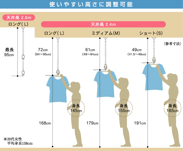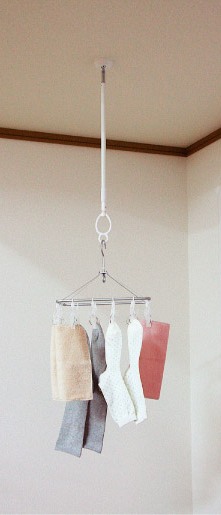 天井にワンタッチでセットできる室内物干し。天井からの吊り下げ高さを調節可能。