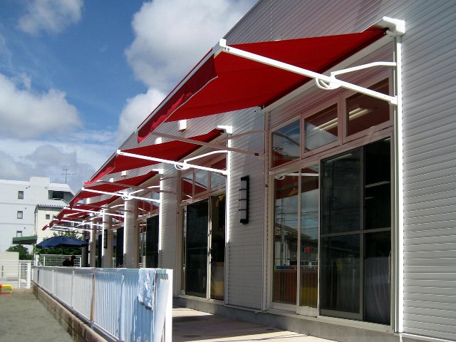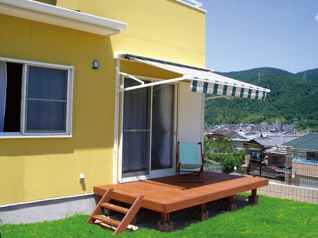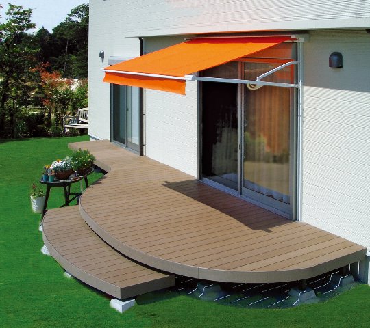 開閉は女性一人でも瞬時にできるワンタッチが特長のテラス用開閉オーニング(手動のみ)。キャンバスはイタリア・パラ社製アクリル生地を使用。30色の中から、好み・建物の外観に合わせて選ぶことができる。