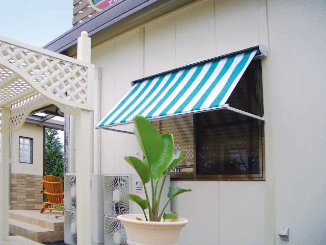 優美なイタリアンタイプ(手動のみ)とシャープなスウェーデンタイプ(手動・電動)は窓用のオーニング。キャンバスはイタリア・パラ社製アクリル生地を使用。30色の中から好みの色・柄を選ぶことができる。