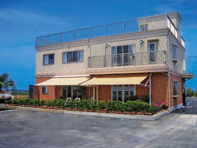 多目的利用に最適な5mの大型サイズの独立型ワイドオーニング(手動のみ)。開閉操作がワンタッチででき、風にも強い。キャンバスはイタリア・パラ社製アクリル生地を使用。30色の中から好みの色・柄を選べる。