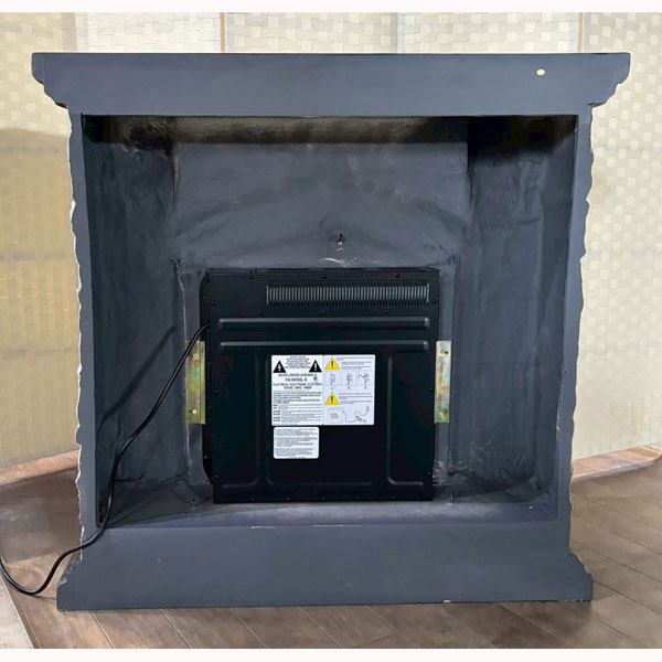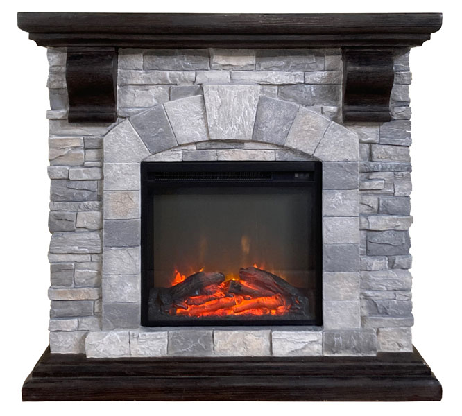 18インチ電気暖炉本体+暖炉棚のセット商品。石組み風の重厚なデザインのマントルピースに、LED電球の光で作り出す炎が本物そっくりに揺らめく。