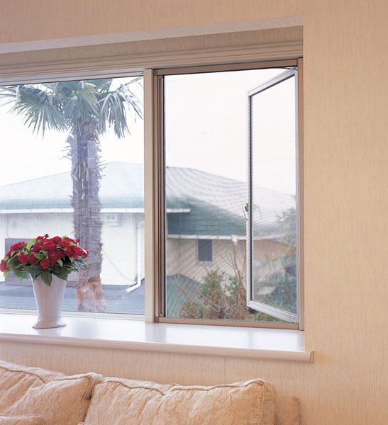 片開き窓や辷り出し窓などの装飾窓に最適な横引きロール網戸。抜け止めのファスナーを使用し、上下に隙間のなく防虫性に優れた収納網戸。網戸の掃除や張替えが簡単に行えるため、メンテナンスがしやすい。