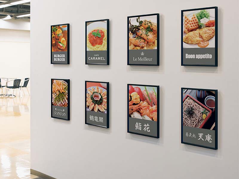 ポスターやメニューなどのプリント紙を簡単にセットして使えるパネル。シンプルで上品なデザインがソフトを引き立て、バリエーション豊富。ポスター・メニューに限らず、サインや案内などにおすすめ。
