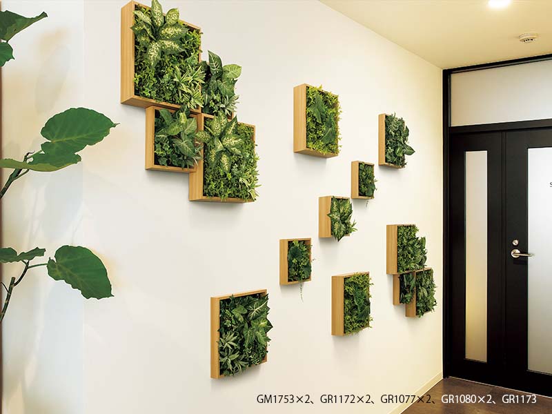 連接グリーンと組み合わせグリーンからなる、グリーンパネル。インパクトのある演出ができて、癒しの効果が最大限に発揮できる。サインやインテリア素材の組み合わせでイメージアップやおもてなし空間が作れる。