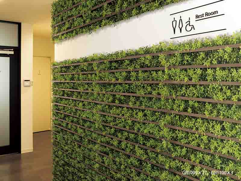 連接グリーンと組み合わせグリーンからなる、グリーンパネル。インパクトのある演出ができて、癒しの効果が最大限に発揮できる。サインやインテリア素材の組み合わせでイメージアップやおもてなし空間が作れる。