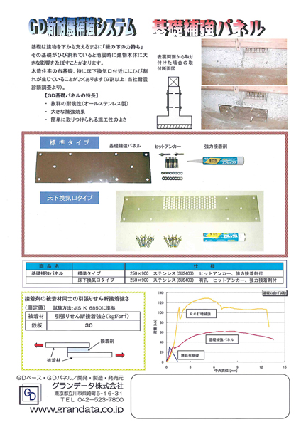 GDパネルは、布基礎に発生した軽微なひび割れを、ステンレス製の補強パネルに専用の樹脂接着剤を塗布して、コンクリート面と圧着して補強する工法。