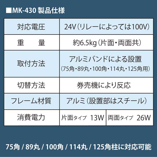 片面タイプと両面タイプの2種類。リレーの入るプラスチック製のボックスや100角スチール柱をオプションで付属可能。