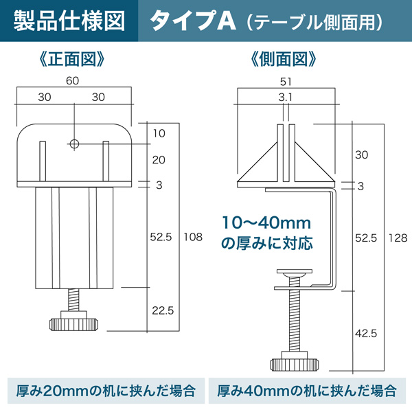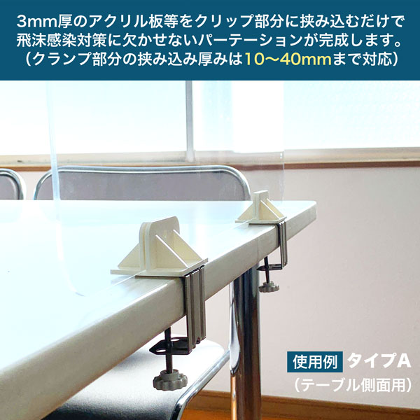 厚さ3mmのアクリル板等を挟むだけでパーテーションが完成。クランプ式のためテーブル面に粘着糊の痕が残らない。クリップ部分は耐衝撃性に優れたABS樹脂製。1セット10個入り。