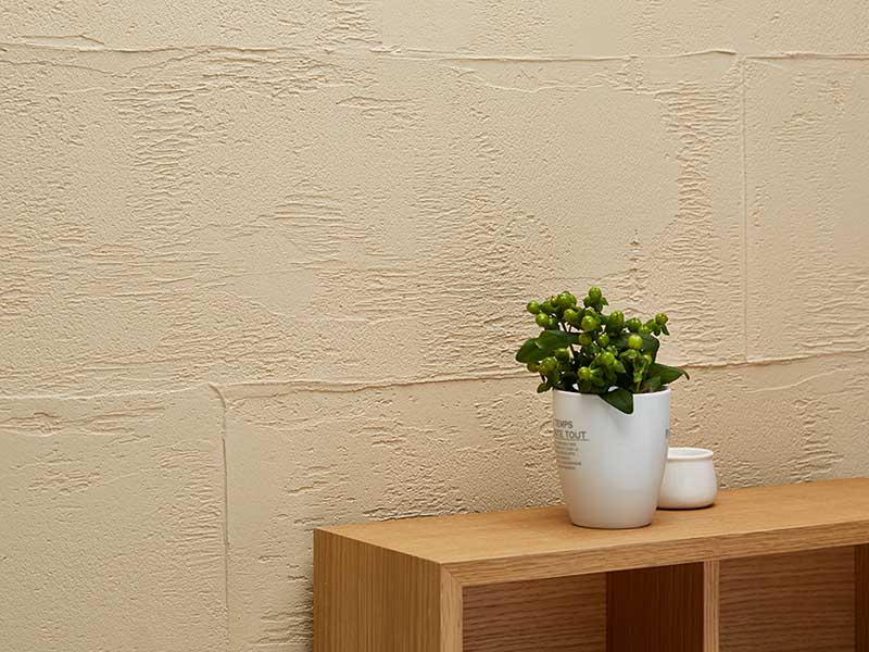 珪藻土を配合した健康志向の仕上げ材。居室の湿度をコントロールする優れた調湿性能があり、結露抑制の効果もありる。さらにシックハウス症候群の原因となっているホルムアルデヒド濃度を低減する効果もある。