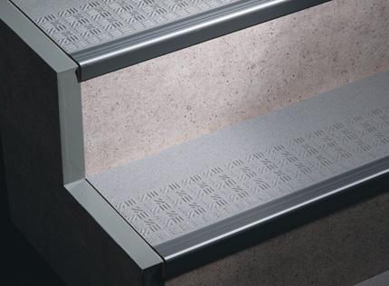 集合住宅の共用階段を快適空間に変える防滑性階段用床材。踏み面のみのタイプ。