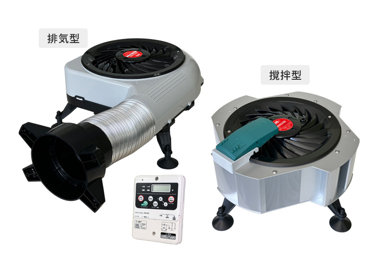 ハイスペックモデル。専用コントローラーは、湿度・温度ツインセンサーで排気と撹拌を効率良く独立運転が可能。安全なアースレス構造。基礎パッキン構造対応。換気口のない床下にもφ100穴加工で容易に取付可能。