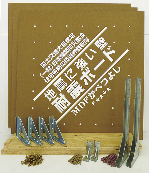 木造住宅の既存の床・天井を壊さずに、建物の内部壁を取り付けて補強することができる耐震補強キット。耐震ボード(MDF)はさまざまな施工状況に対応するため、各種仕様(大壁・真壁・後施工柱)を備えている。