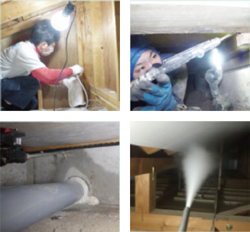 ボロンdeガード工法は、ホウ酸を用いた自然素材ベースの防蟻・防腐技術。1次防蟻(シロアリの侵入経路遮断)と2次防蟻・防腐(木材の高耐久化処理)により、居住者の安全や環境へ配慮しつつ、高い防蟻性能を発揮。