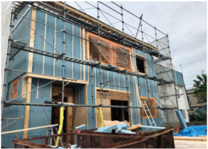外張り断熱。1層目の付加断熱の施工を終えた様子