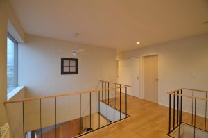 2 階吹き抜けと廊下。窓を開けておくと吹き抜けから上がる暖気の循環で、室温が確保できる