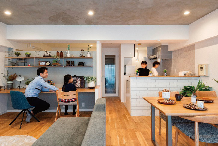 スタディースペースも備え家族みんなが集えるLDKリビング。キッチンはリビングと対面したL字型で、2人でも調理ができる。冷蔵庫の向かいには念願だったパントリーも設置。奥にある寝室の間の壁は、通風と採光を考えて開口した。