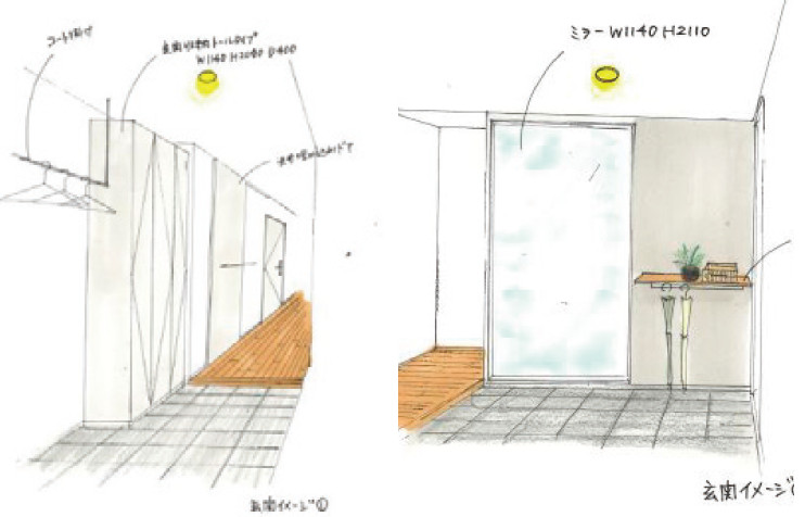 玄関は間口とたたきを広げて「家の第一印象UP」。大きな鏡は空間を広く見せる役割もある。入って右側には、鍵などの小物を置けるアイアンバ ー付きの棚、左側には雨合羽やコートを掛けられるハンガーバーを設置。