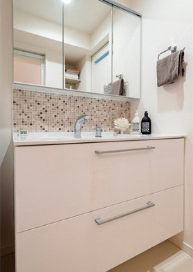 洗面台にあしらったモザイクタイルも、キッチンのタイル同様に光沢感のない素材を選択。汚れがさっと落ち るのでお手入れしやすく、上質感のある空間が完成した。