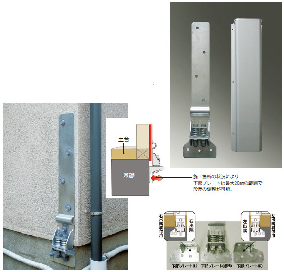 建物の外観を壊さずに大切な住まいの基礎・土台・柱(通し柱)を緊結し、「ホゾ抜け」を防止する後付けホールダウン金物。取付箇所にあわせて下部プレートを左・右仕様に交換でき最大20㎜の範囲で段差の調整が可能。