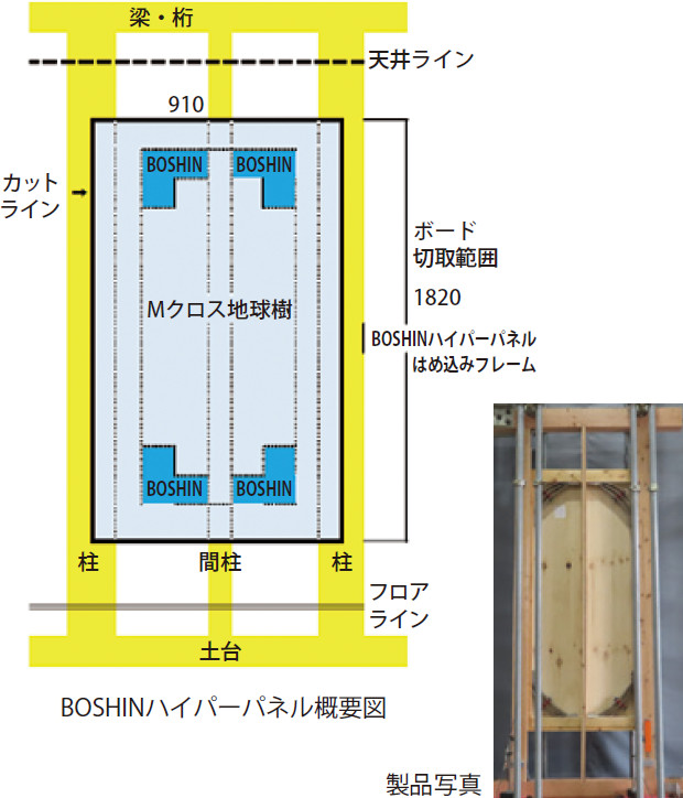壁にはめ込んだフレームの四隅に「BOSHIN」を設置することで制・耐震工事ができる。
