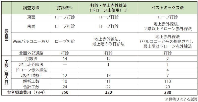 打診法での全面打診に比べて、工数、参考概算費用ともに約20%削減可能(共同開発会社比)。