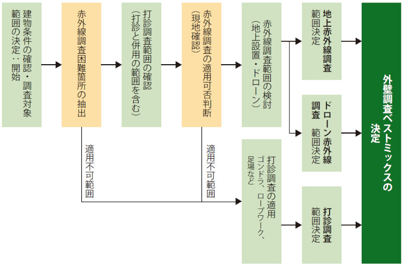 ドローン赤外線法は、地上赤外線では撮影が難しい高所の撮影が可能。実施範囲は全面積の2割程度。