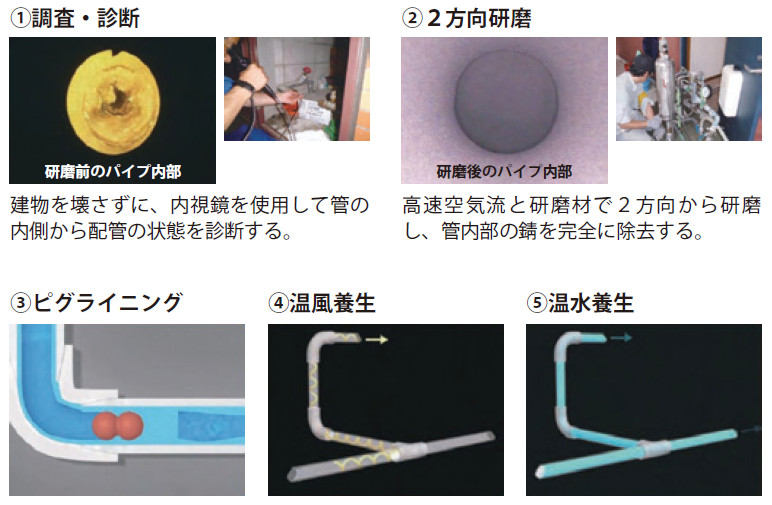 「NPLⅣ工法」「NPBⅢ工法」「NPBラピッドⅡ工法」は、既存集合住宅の劣化した硬質水道用塩化ビニルライニング鋼管に対して、赤水対策と配管の延命を施すことができる技術。