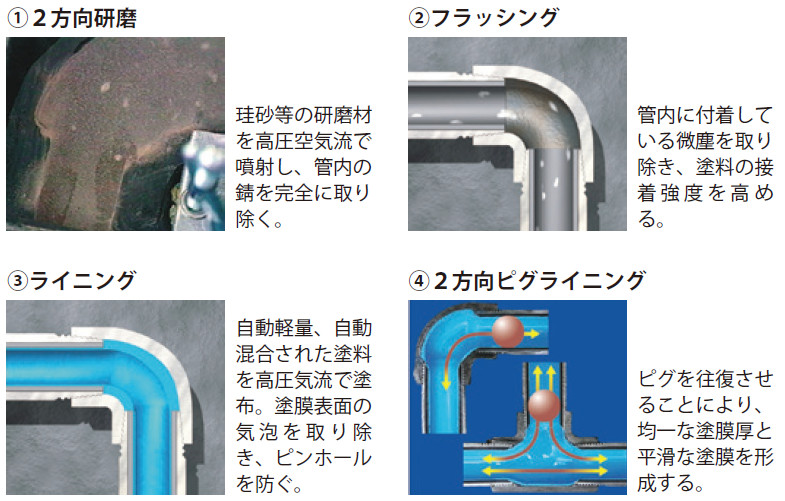 配管径15A~100Aの管内部の錆および付着物を除去するために2方向研磨を行った後、エポキシ樹脂塗料を2回塗布し、塗膜を調整する。