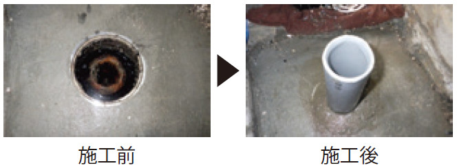 排水口へ固定した塩ビ管よりトラップ本体、排水管までを高強度アラミド繊維補強FRPで一体成型することで、従来工法では対応が難しかった現場のユニットバスリフォームが可能となる。