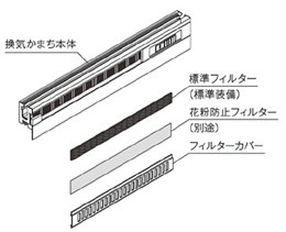 引違い窓には、窓を閉めたまま換気が行える「フィルター付き換気かまち」をラインアップ。