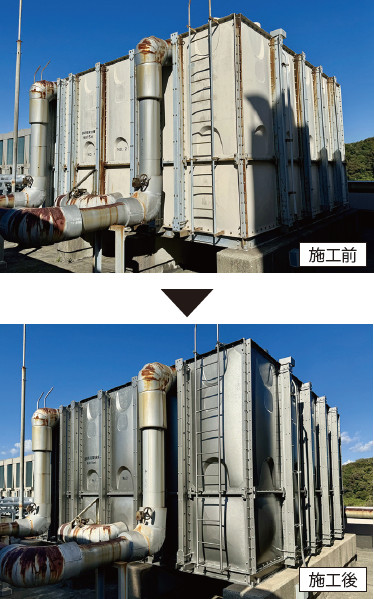 貯水槽の延命対策として、特殊樹脂を外部にコーティングすることにより、高い耐候性・遮光性・安全性を実現する工法。