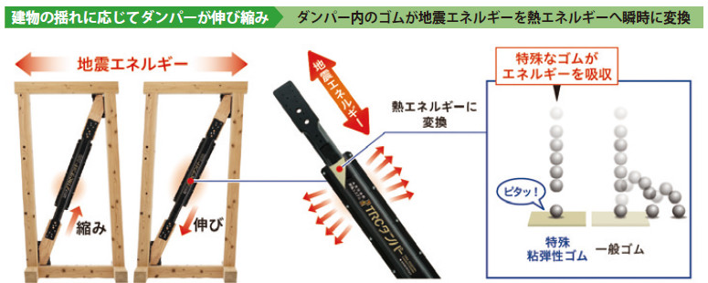 本技術では、同社のゴム配合技術を応用した「特殊粘弾性ゴム」をダンパー内に組み込み、地震時にそのゴムが伸縮することで、地震エネルギーを熱エネルギーに変換し、揺れを低減させる。